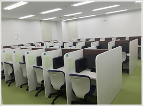 各席にパソコンがあり、ここで授業を受けます。座席が50席近くあり、1つ1つの席が仕切られているので、集中して受講・自習をすることができます。定期テスト前には、学校の課題や宿題などにも活用してくれています。