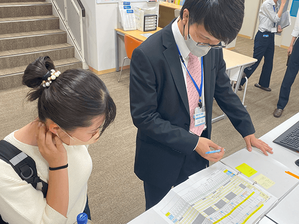 生徒が来校したタイミングで、今日取り組む勉強内容をスタッフが必ず確認していきます。また下校する際にも予定通りに勉強が進んでいるのか確認し、その都度計画を修正を行っております。